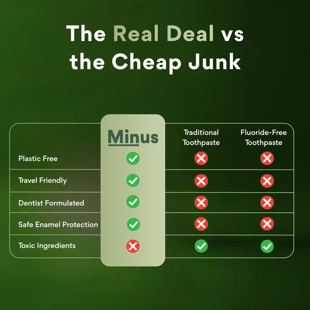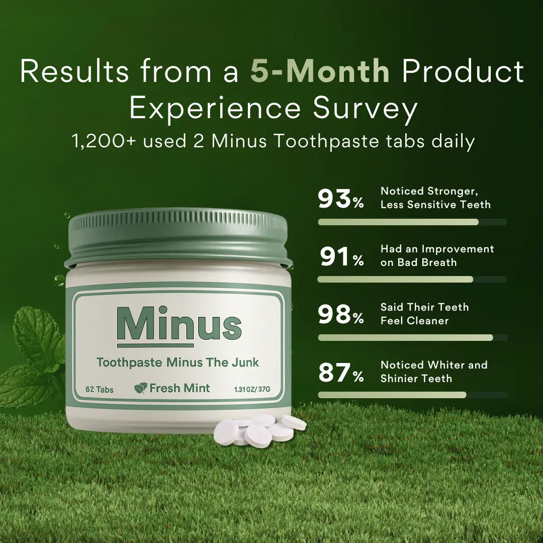 Minus Toothpaste Tablets are a natural, science-backed way to brush your teeth. Each tablet contains 5% nano-hydroxyapatite (the same mineral your teeth are made of) to rebuild enamel, prevent cavities, and give you fresher breath. No fluoride, no plastic tubes, no messy paste.